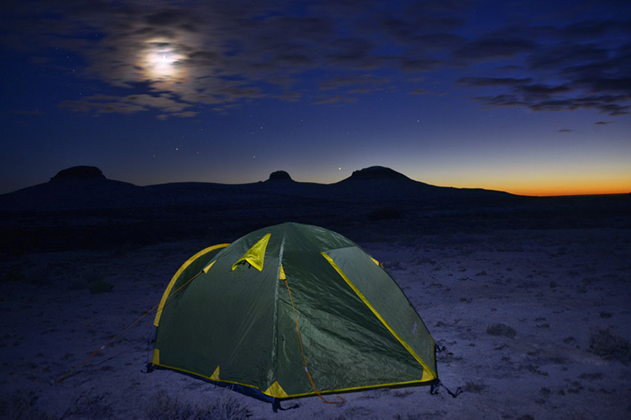 Nächte im "5-Millionen-Sterne Hotel" Seinen ganz besonderen Reiz hat die Wüste von Mangghystau, wenn die Sonne untergeht. Die Felsen wechseln ihre Farben von Minute zu Minute. Von hellen Braun- und Sandtönen wandern sie zu vielen Schattierung von Grau und Schwarz. Wenn die Sonne dann komplett verschwunden ist, glaubt man noch mehr auf dem Mond angekommen zu sein. Keinerlei Lichtverschmutzung: