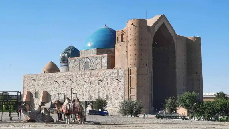 TURKISTAN Das Mausoleum von Hodscha Ahmad Yasawi wurde im Auftrag des Mongolen-Herrschers Timur zwischen 1389 und 1405 errichtet. Obwohl in Teilen unvollendet, ist es eines der größten und am besten erhaltenen Bauwerke aus der Zeit Timurs. Am Mausoleum von Yasawi erprobte er die Bautechnik und Dekorkunst, welche später in seiner Hauptstadt Samarkand erstrahlen sollte.