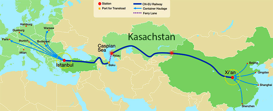 Kasachstan ist nicht nur das größte Binnenland der Welt, es liegt von allen Weltmeeren auch am weitesten entfernt - mittendrin eben. Und deshalb ist es als Drehscheibe für den internationalen Handel im Rahmen der "Belt and Road Initiative" von zunehmender Bedeutung. Kasachstan, das bis 1991 zur Sowjetunion gehörte, hat die gleiche Spurbreite wie Russland und die meisten anderen Ex-Sowjetrepubliken, China dagegen dieselbe wie Europa. Deshalb müssen in der Grenzstadt Khorgas die Container aus China wegen der unterschiedlichen Spurbreite auf kasachische Züge umgeladen werden, um ihre Reise in Richtung Europa fortzusetzen. Wer von Khorgas mit der Bahn bis nach Aktau am Kaspischen Meer reisen will, ist - bei idealer Verbindung - mindestens zweieinhalb Tage unterwegs und durchkreuzt dabei zwei Zeitzonen.